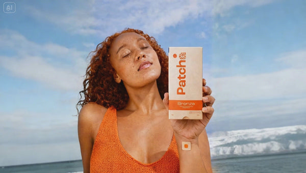 PATCHA BRONZE est un patch cutané vitaminé conçu pour aider la peau à maintenir un éclat doré naturel et à sublimer l’apparence du teint halé.